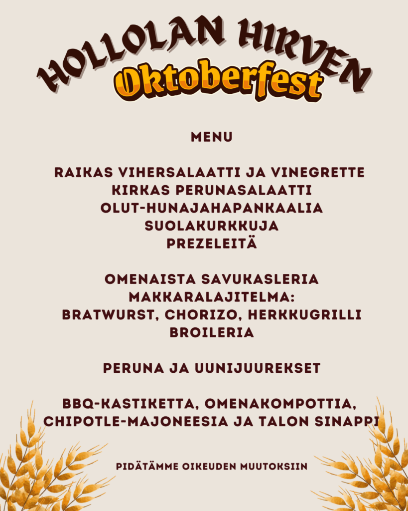 Tervetuloa nauttimaan perinteisestä Oktoberfest-illasta, herkullisesta ruoasta, oman panimon oluista ja livemusiikista tunnelmalliseen Hollolan Hirveen.